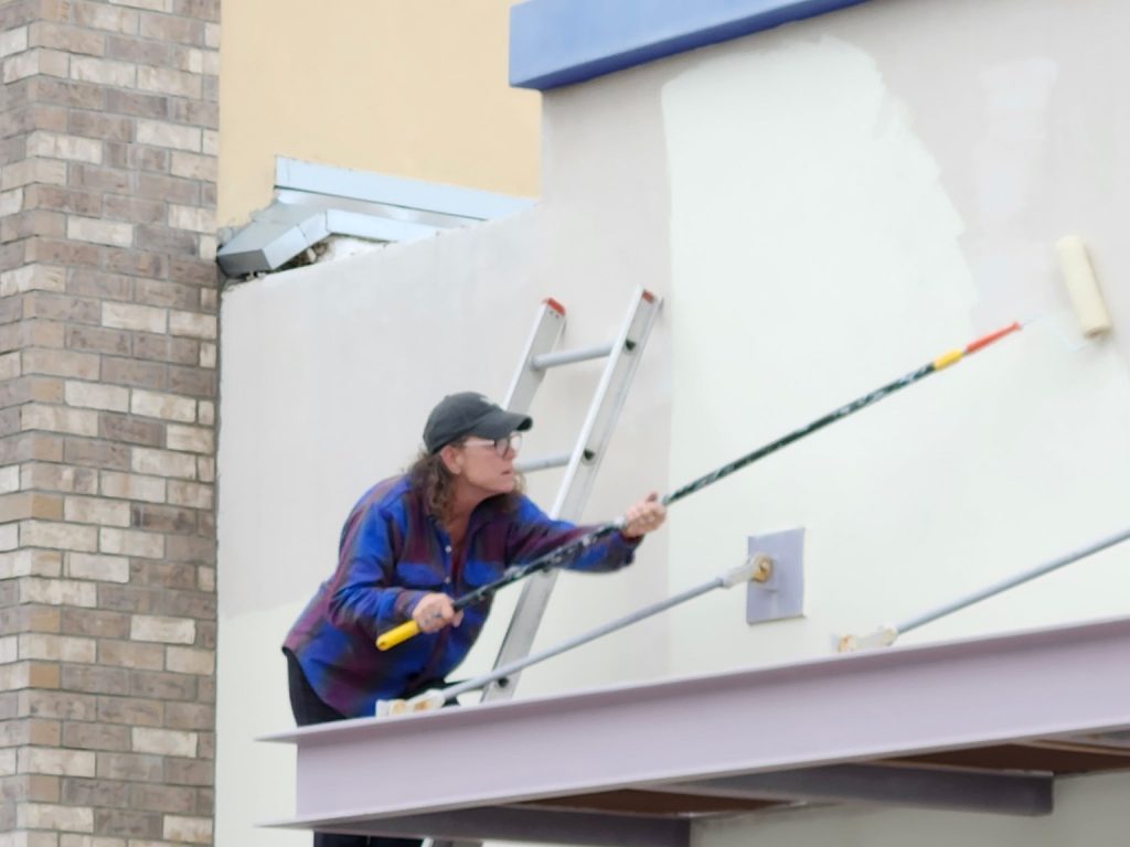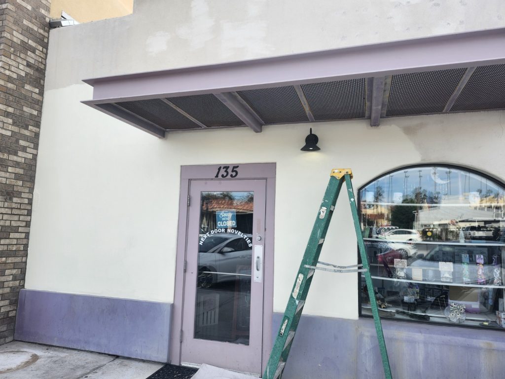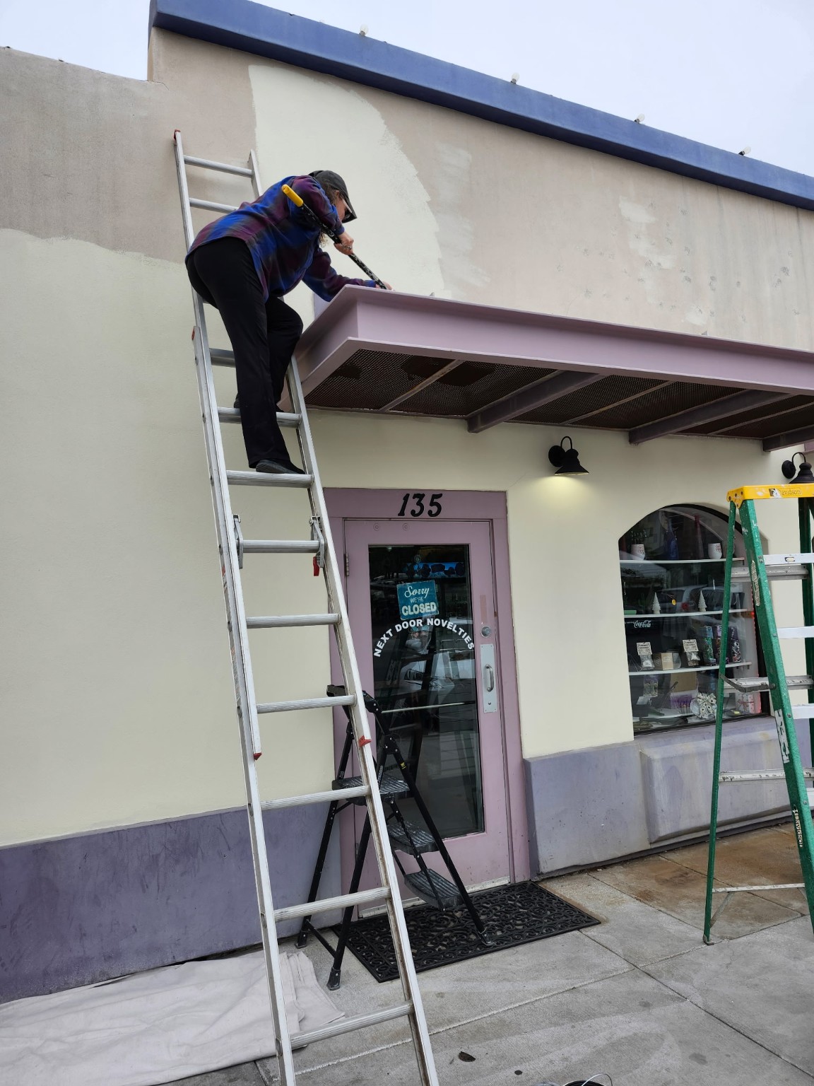 On Tuesday and Wednesday, Peg and Cheryl rolled up our sleeves and repainted the entire front of the building. Tuesday was dedicated to the lower portion below the awnings, and Wednesday we tackled everything above them. All told, it was about five hours each day, two gallons of paint, and a whole lot of climbing up and down ladders. We even painted during the rain sprinkle that threatened to derail us.