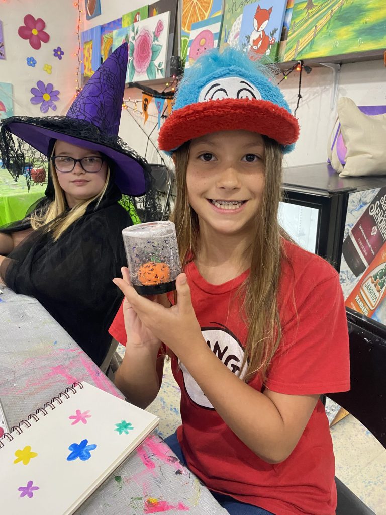 Along with these projects, students painted pottery, made wood board art, and made personalized trick or treat tote bags. The last day of camp was spent assembling all the projects and seeing the final result of each one, as well a costume party on the patio including games, face painting and hydro dipping pumpkins!