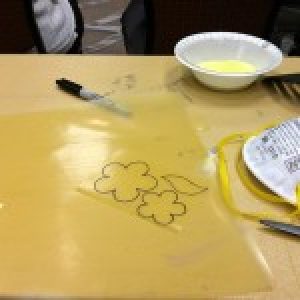Cheryl attended a class on fused glass wafers. This is an awesome technology that allows us to offer the ability to create with fused glass any shape or words that can be cut out manually or with a vinyl cutter. We will be offering this great option at the studio very soon. The possibilities are very exciting and we are especially looking forward to creating crisp words. The sample created in class was a simple design, but any design can be created.