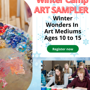We have themed camps three hours per day for four days packed full of art projects. Each week is a different theme. The Winter Wonders In Art Mediums Art Sampler focuses on a variety of art mediums throughout the week including clay hand-building, canvas painting, pottery painting, wood board art, mixed media, art journaling, water color painting, polymer clay, glass, and more.
